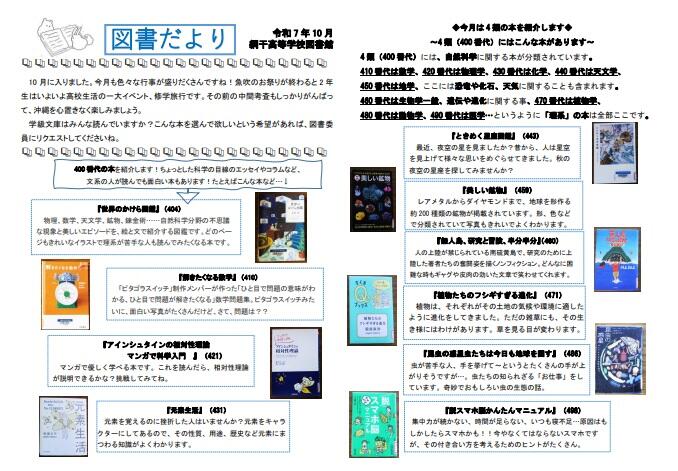 10月も半ばになりました。暑かったり寒かったりで、体調の管理が難しい毎日です。中間考査が終わり、お祭りシーズンが終わったら、「読書の秋」を楽しんでほしいなと思います。いろんな本があるので、図書室に来てみてね!