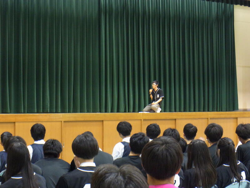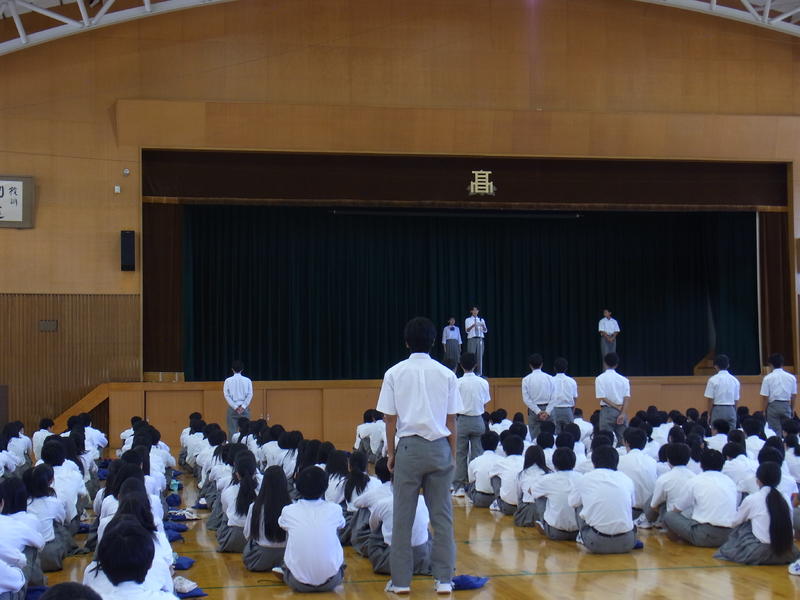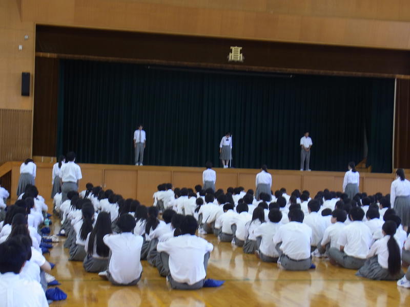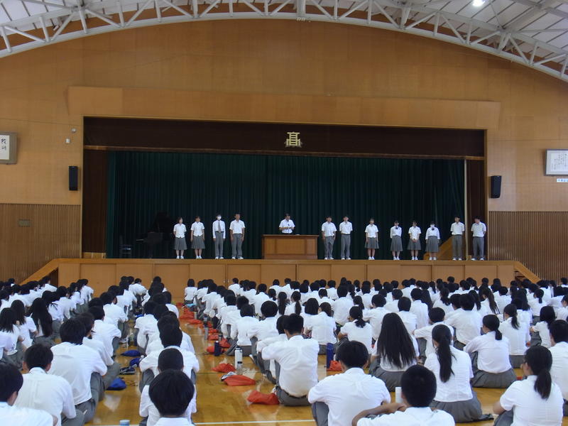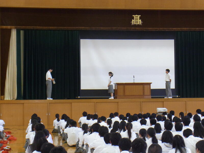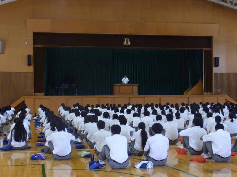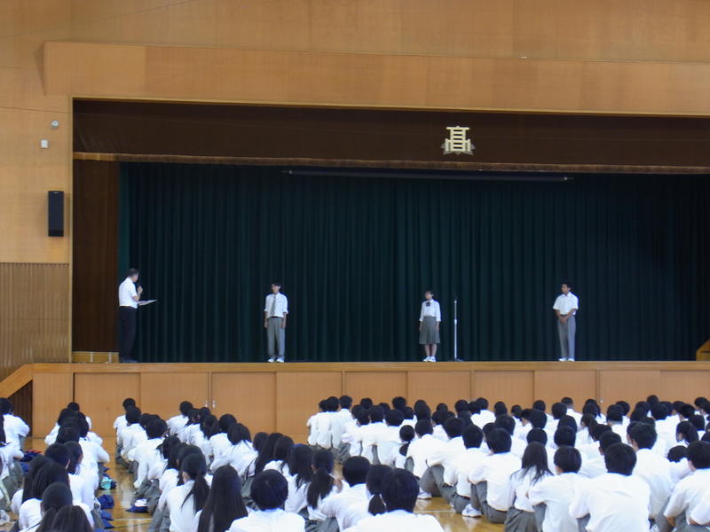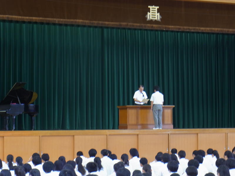 そして、各学年に向けて、3年生には、進路実現に向けて興味があることを見つけ、趣味などで気持ちを切り替えながら学習に取り組むように、2年生には、学校生活の活動の中心の立場になるので、しっかり目標を定めて1年生を引っ張って行けるように、1年生には、高校生になって初めての夏休みなので、夏休み期間中に進学について調べたり、オープンキャンパスに参加したりし自分の進路を考えてみるように話されました。