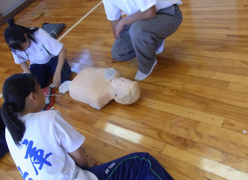 7月19日金曜日、運動部員を対象に、AED(自動体外式除細動器)を使用した心肺蘇生法の講習会を行いました。4つのグループに分かれて養護教諭の指導のもと、参加者全員がAEDを使用した心肺蘇生法を実践訓練しました。暑い中、全員が一生懸命講習に取り組みました。