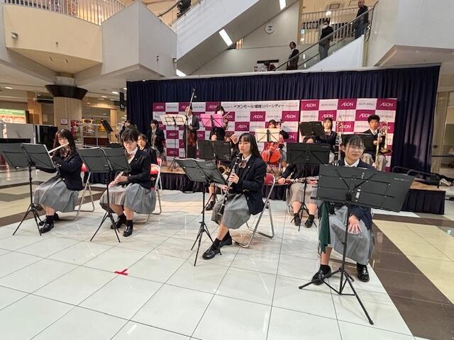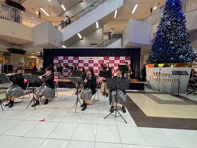 12月7日(土)、吹奏楽部と弦楽部は、飾磨のリバーシティーで行われる恒例のクリスマスコンサートに参加しました。クリスマスの雰囲気の溢れるステージでたくさんのお客さんを前に、弦楽部、吹奏楽部がそれぞれ3曲ずつ演奏しました。アンコールに合同で演奏をしたゲームのテーマ曲で、会場はお客さんも一緒に盛り上がりました。