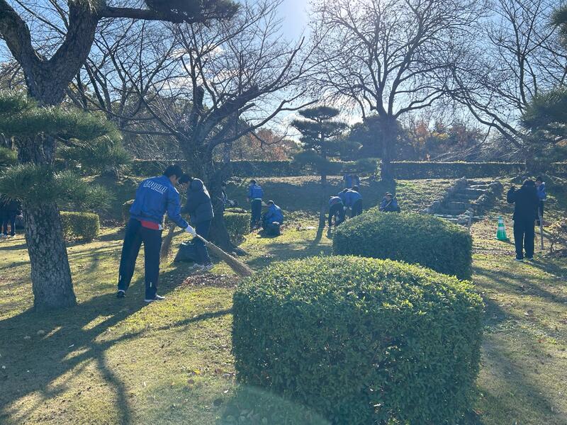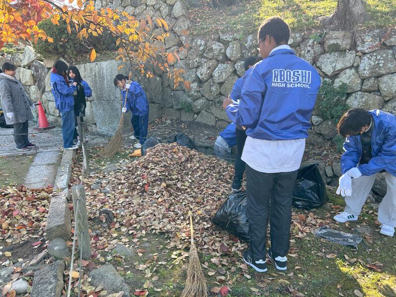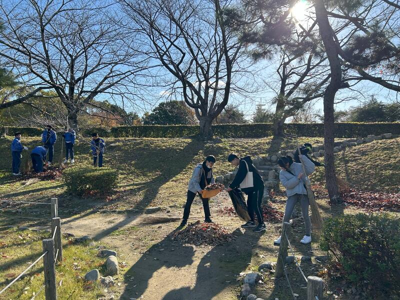 12月8日(日)、生徒会、野球部、陸上部は発展的統合学校間交流事業の一環として姫路城の一斉掃除に参加しました。市内の中学生や地域の人々、姫路市内の企業や銀行、商店街などの皆さんと一緒に朝9時前から、グループに分かれて姫路城の清掃をしました。風は冷たかったけれど良いお天気で、持っていた袋はすぐにごみでいっぱいとなりました。三の丸広場だけでなくお城の敷地内のあちこちの通路や溝などにたまった落ち葉もたくさん集めました。年末年始には、きれいになった姫路城にたくさんの人が訪れることでしょう。