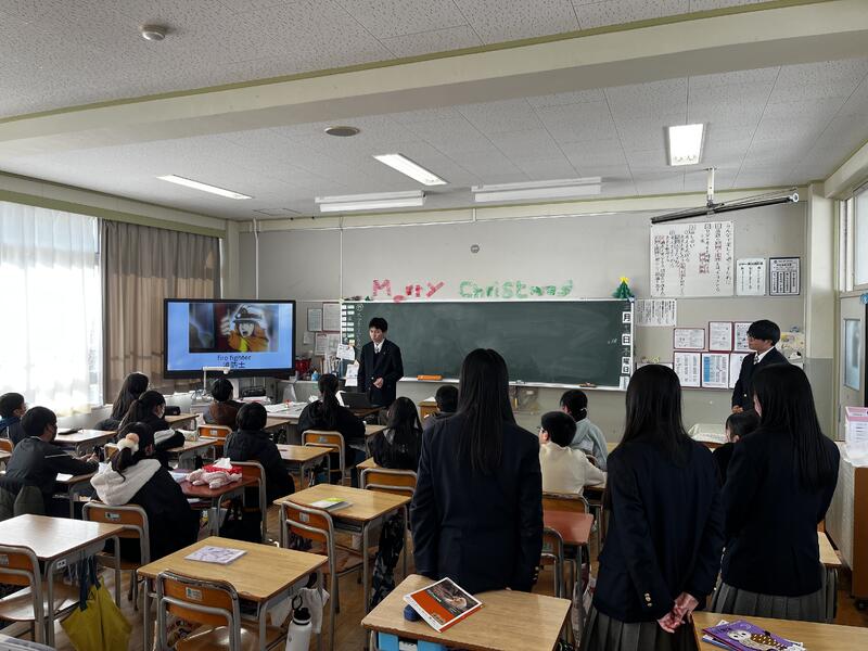 12月12日(木) 2年生の特色類型の生徒20名は、小高連携事業の一環として網干西小学校の6年生のクラスに英語の出前授業に行きました。3班に分かれて、小学生が英語に親しんでもらえるようゲームなどを取り入れた授業を行いました。教える側の生徒たちは、はじめは少し緊張した様子でしたが、次第に笑顔も出て元気な6年生の児童たちと一緒に楽しく英語の授業を楽しみました。