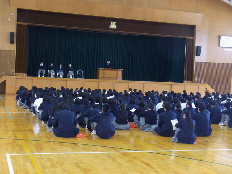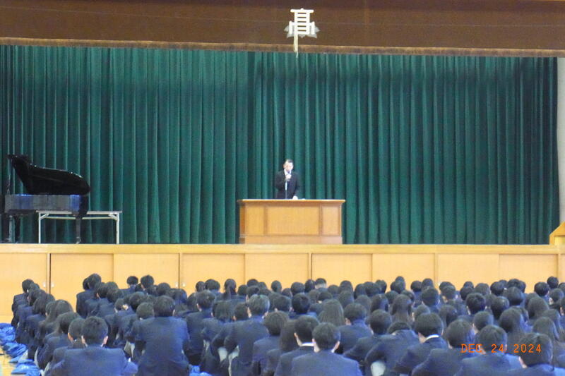 今年は自然災害をはじめ様々な問題があった一年でした。知識についてはAIが代行していくかもしれません。答えのない問題についてもっとも適した対処方法を考えていくというのは、人間に求められていることです。講和では富田林市でバナナの栽培を研究して収穫に成功した方の話を例にして探究活動の意義を話されました。そのためには、たくさんの人と出会ったり、色々な本を読んだりしながら、自分と対話していく事が大切です。そして、客観的な立場にたって周囲の人のことを考えたふるまいのできる人、人の話を聞ける人になってください。自分の領域と他人の領域をきちんと考えて行動をしてください。また、命を大切にし、周りの人を思いやる心を忘れないようにして下さい。冬季休学中は病気やけがに気を付けて、家族や、久しぶりに会う人たちと充実した時間を過ごしてください。