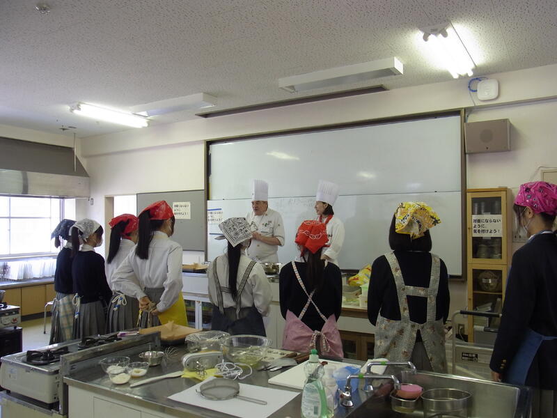 4限目は、校内の見学後、2班に分かれて調理実習と茶道の体験です。図書室では、以前のウッドヴェールの生徒達との写真を興味深く眺めたり、色々な本を手に取ってみたりし、理科の教室なども見て回りました。