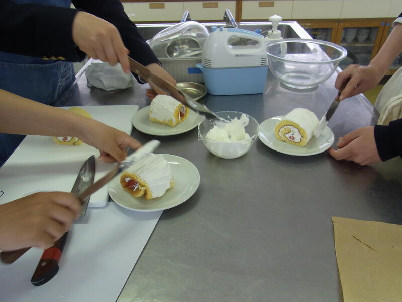 調理室では、3年生のフードデザインの生徒達とおにぎりを作って食べる体験をしました。ラップを使用し、炊き立ての熱いご飯に四苦八苦しながらも、好きな具を選んで丸く握ったおにぎりを皆でおいしく頂きました。