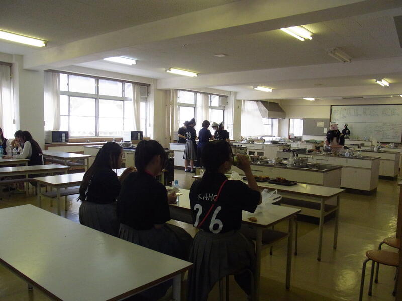 この日は、訓練の後に防災食の試食も行いました。生徒達は各クラスで、生徒リーダーたちと地域の方々は食堂で、お湯を入れてごはんができるアルファ米、キャラメルや羊羹などの甘いもの、備蓄用の水、乾パンやパンなどを皆で試食しました。