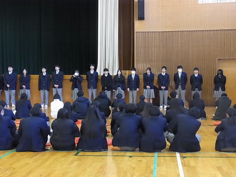 4月からは、今並んでいる2学年8クラスが全校生になります。教師の数も減ります。部活動などに於いて、これまで以上に自主性が求められることになります。一人一人の意識をしっかり持って学習や部活をやっていってください。今、校内の色々な場所を次の年度に向けて、活用しやすいようにするための工事や補修を行っています。一人一人の意識をしっかりと持って、学習や部活に参加していってください。