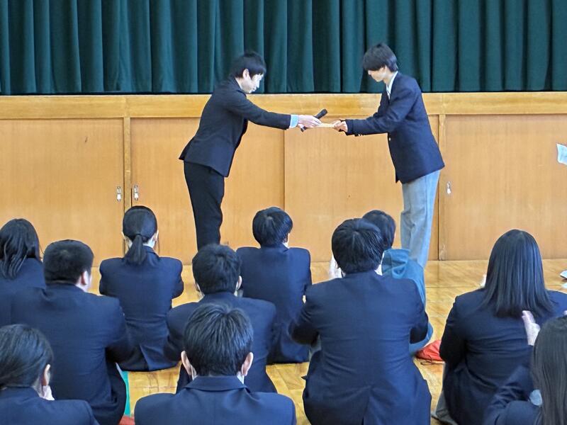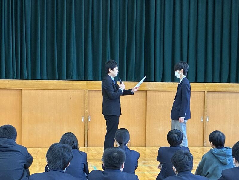 その後は、表彰伝達式が行われ、男子ソフトテニス部に賞状が渡されました。同時に、先週の球技大会での優勝チームと2位のチームの表彰も行われました。 ケガや事故に注意をして、全員そろって1月8日の始業式を迎えましょう。