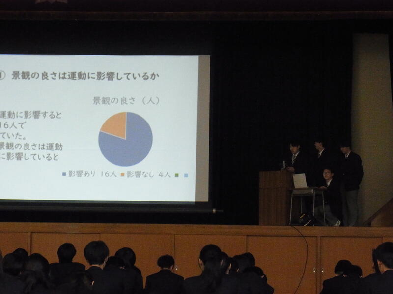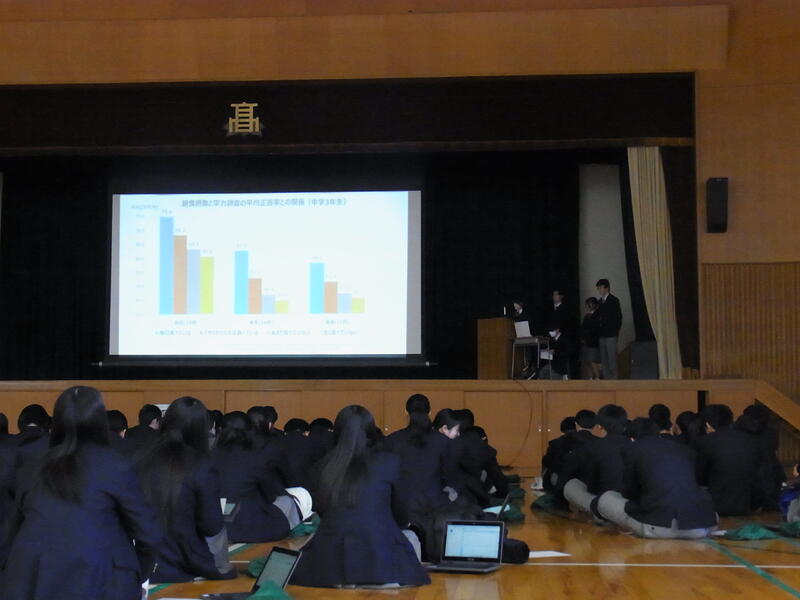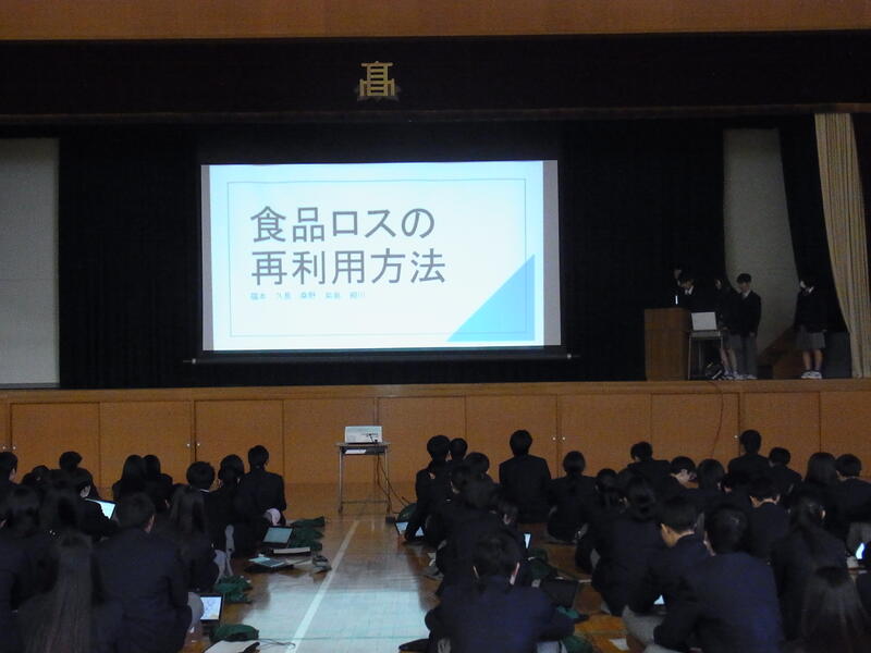 2月5日(木)、6、7限に2年生の探究学習の発表会が体育館で行われました。各テーマの中から選ばれた代表チー ムがパワーポイントの画面をスクリーンに映しながら、この一年間に取り組んできたことの成果を発表しました。島根 大学の作野先生にも、オンラインで発表を見ていただきました。