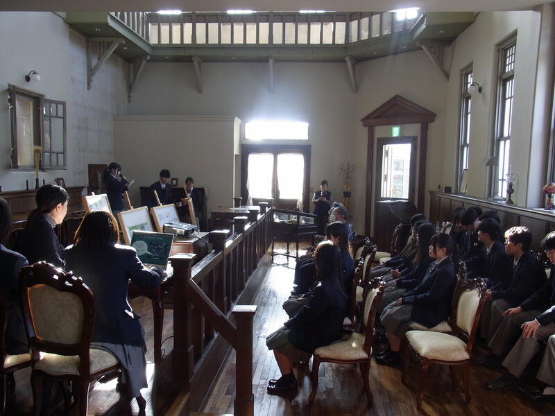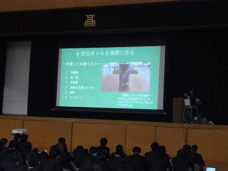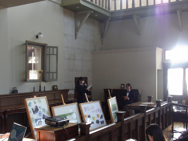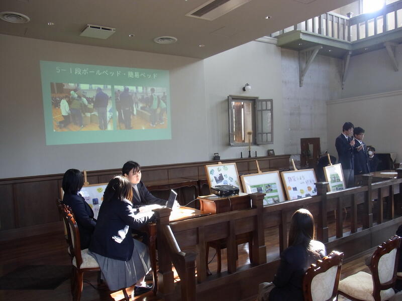 2月13日(金)の5,6限に、2年生のふるさと共創プロジェクトチームの発表会が、新在家にある旧・網干銀行湊倶楽部で行われました。地域の方と共同で行った防災訓練や、生徒達が行った防災町歩きなどで体験したことをパネルとパワーポイントにまとめ、生徒会のメンバーによる司会進行で発表しました。防災訓練に参加された自治会の方々も発表を見に来られました。