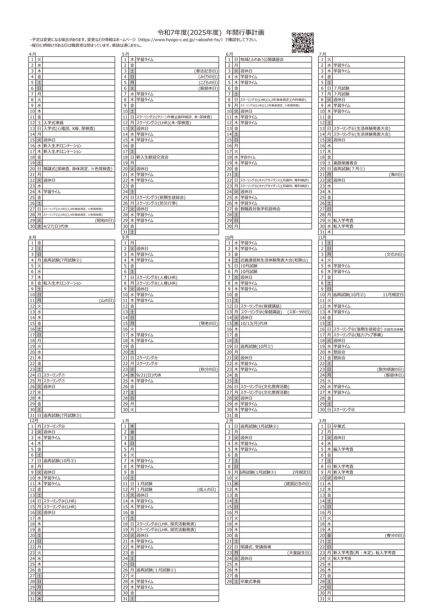 スクーリング、テストのほか、入学式・開講式などの学校行事があり、年間に20日程度登校することになります。