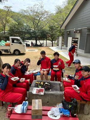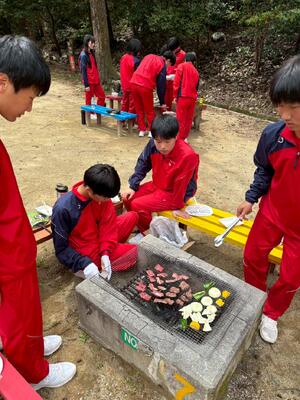 その後は、バーベキュー。火起こしに苦戦する班もたくさんあったようですが、無事にすべての班が肉や野菜をおいしく食べることができました。焼きおにぎりを作っている班もありました。