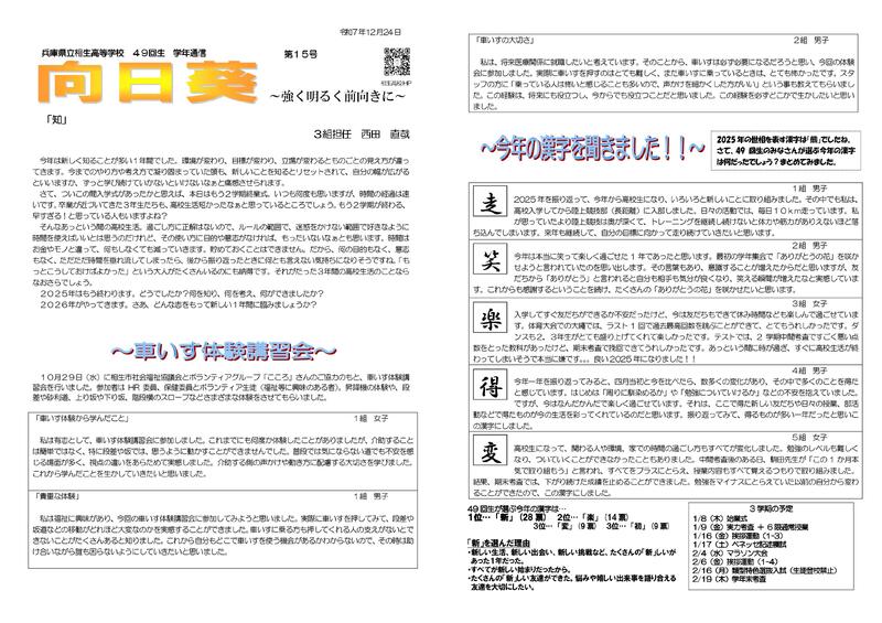 【49回生 学年通信】第15号を発行しました 投稿日時 : 12/24 49回生 49回生 学年通信 第15号を発行しました。3組担任のメッセージ、車いす体験講習会の感想、49回生が選ぶ今年の漢字 等を掲載しています。