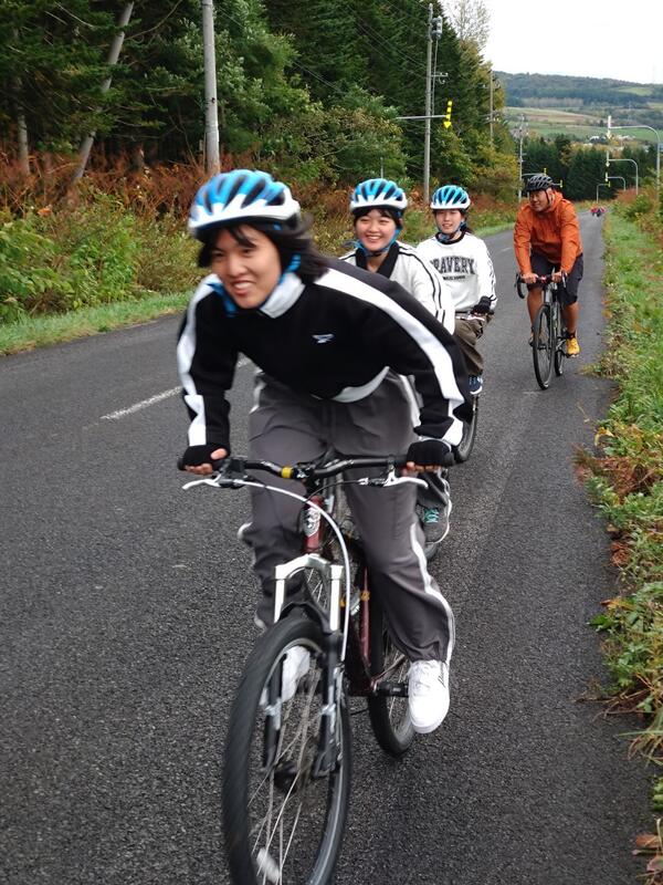 最初の上り坂ゾーンを過ぎれば、あとは下り基調の道です。北海道の広大な田園風景の中を行きます。