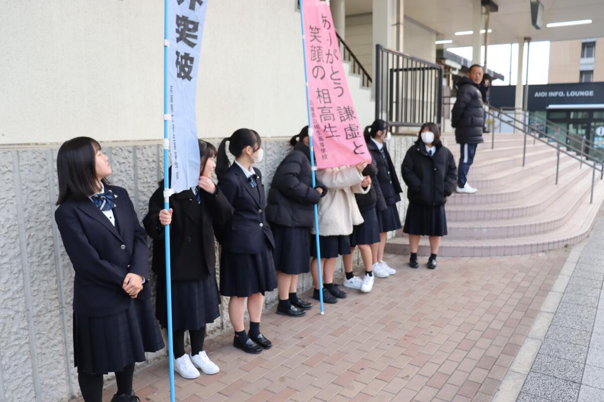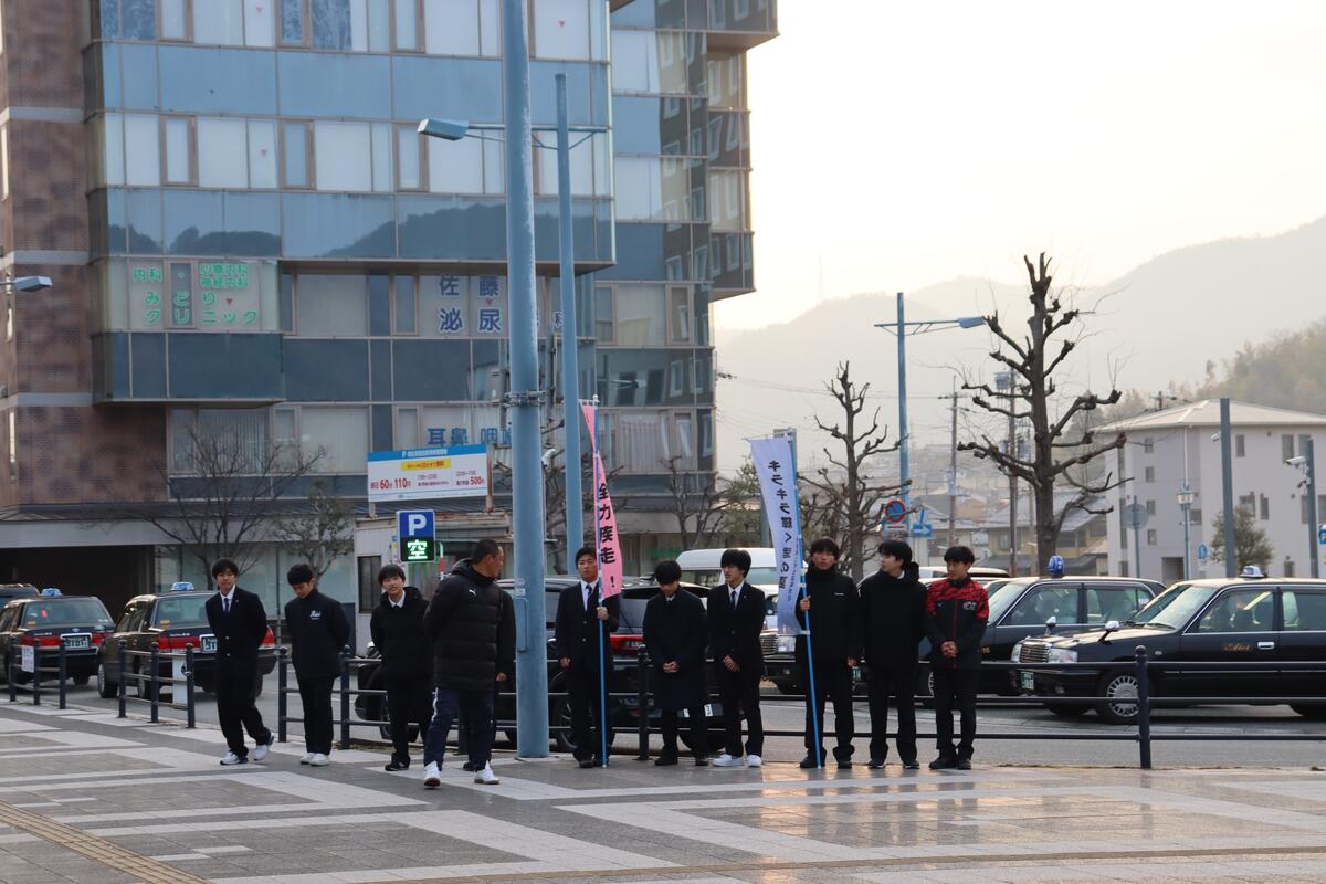 49回生 さわやか挨拶運動に参加 投稿日時 : 02/06 49回生 2月6日(金)、早朝7時半より「さわやか挨拶運動」を実施しました。今月は、生徒会メンバーに加えて、1年4組の半分の18名が一緒に行いました。
