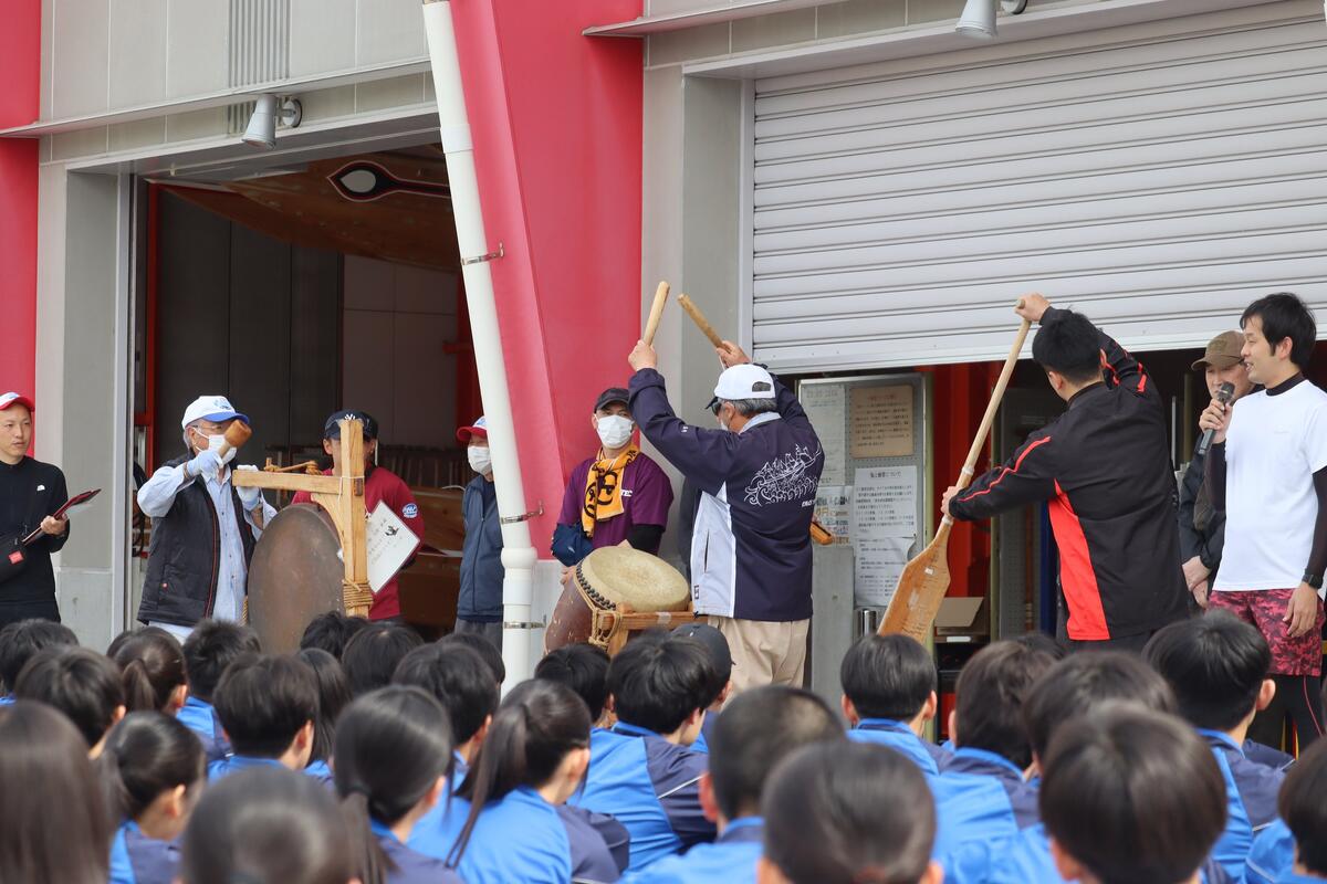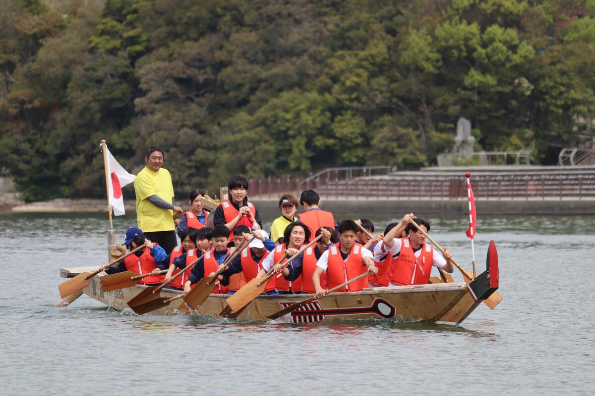 各クラスを紅白の2つずつの班に分け、午前中はペーロンに乗船しての漕ぎ方練習とペーロン文化についての学習を交互に行いました。相生市地域振興課商工観光係の破魔様と、ペーロン協会のみなさまに熱心にご指導していただきました。