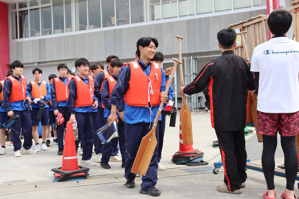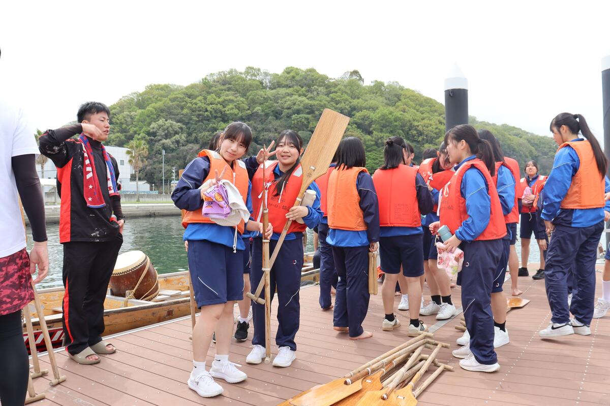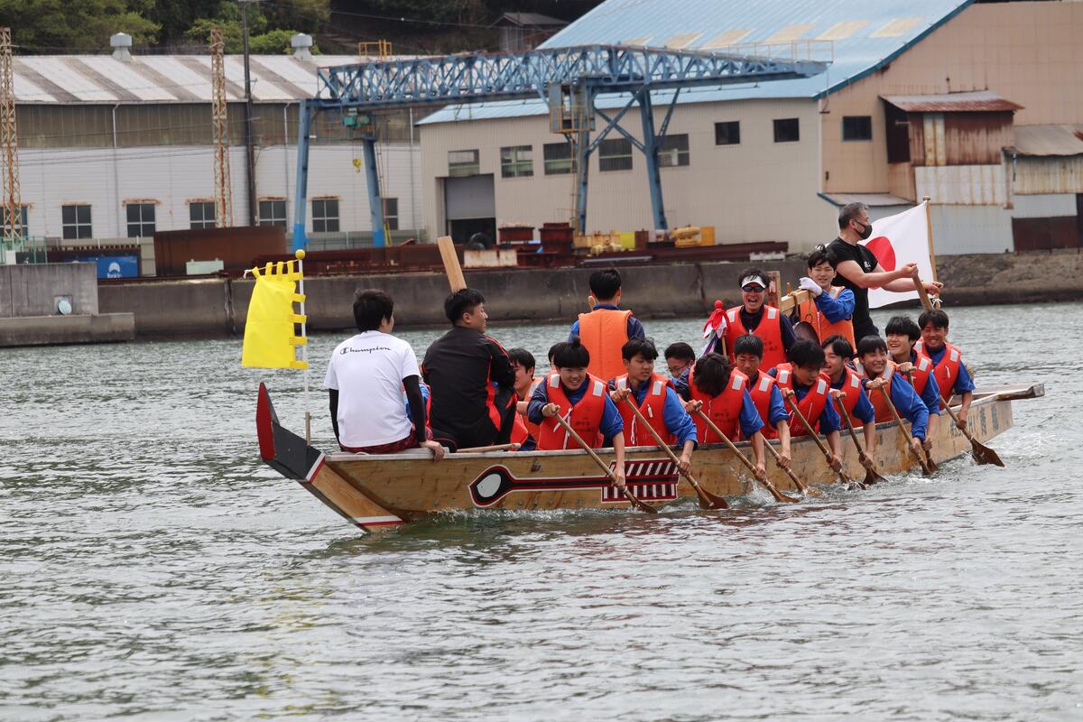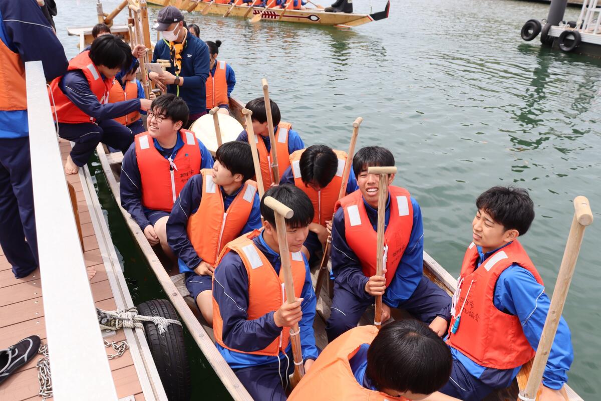 漕ぎ方練習では、担任の大きな掛け声のもと銅鑼や太鼓の独特のリズムに合わせて櫂(かい)を一斉に漕ぐ練習を時間をかけて行いました。小さかった声も徐々に大きくなり、バラバラだった櫂の動きもなんとか揃っていきました。叱咤激励してくださるペーロン協会の方々の熱い思いが生徒たちに伝わったのでしょう。