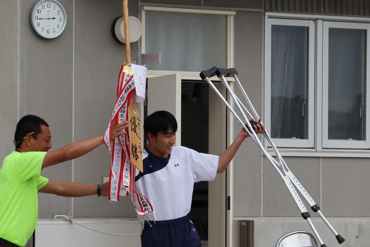 午後は10の班の予選レースとそれを勝ち抜いた5つの班による決勝レースを行いました。予選第1組の紅班では2組と5組、第2組の白班では5組と4組が勝ち抜き、最後の1枠をわずかなタイム差で3組白班が勝ち取りました。決勝戦では、どの班も今まで以上のチームワークを見せ、5組白班が2組紅班を僅差でかわし、優勝の栄誉を勝ち取りました。決勝に進めなかった班も、最後の最後まで熱心な応援を続け非常に盛り上がりました。すべてが終わった後は力を出し切った達成感にあふれており、ペーロン協会の方からも非常に良い競漕だったとお褒めの言葉をいただきました。49回生の船出を力強く感じることができた一日でした。