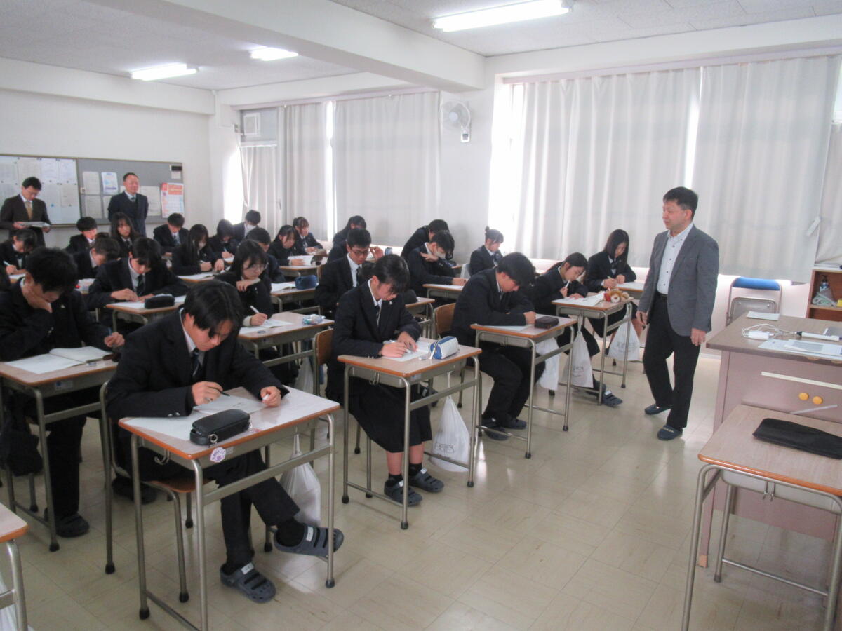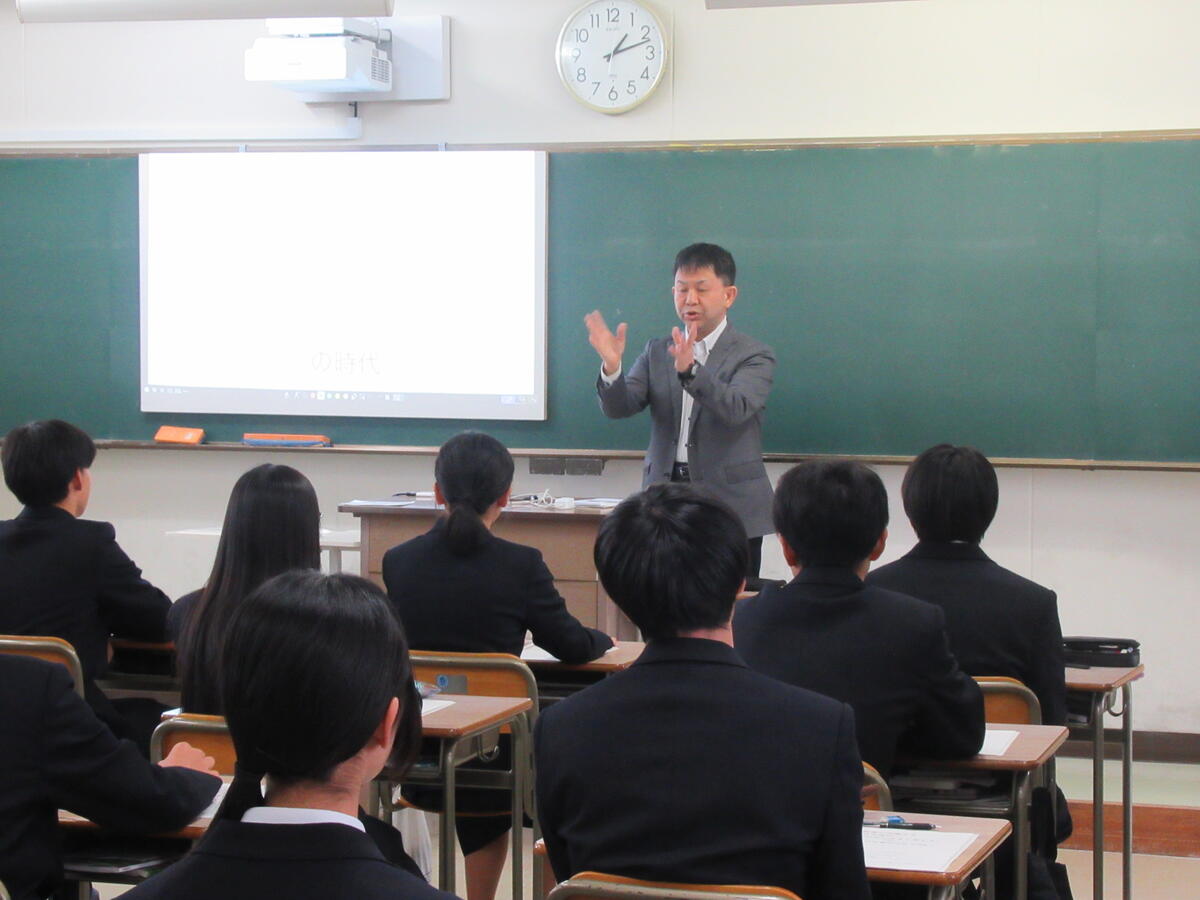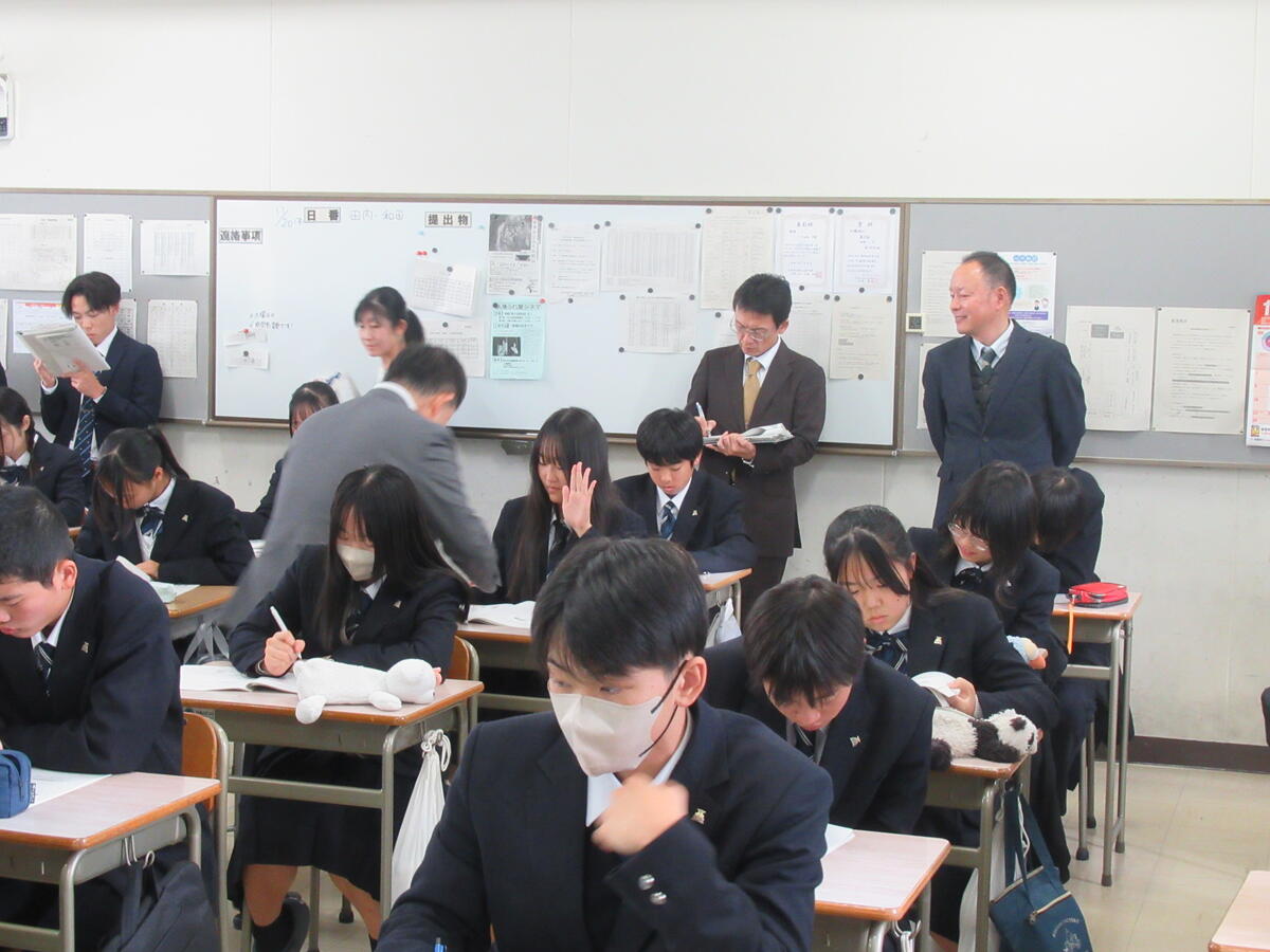 11月20日(木)の5時間目に1年2組の生徒が数学特別講義を受けました。参考書「Focus Gold」の著者でもある名城大学の竹内英人先生に「これからの時代に求められる数学力とは?」という演題で”教えない授業”をテーマに授業を実践していただきました。身近にある題材で、簡単に解けそうでなかなか解けない思考力を問う問題を考えていきました。先生からはヒントや答えを与えず、しかしながら全員が頭を悩ませながらも熱心に取り組みました。今回の講義が今後の授業でも主体的に取り組んでいくきっかけになればと期待します。