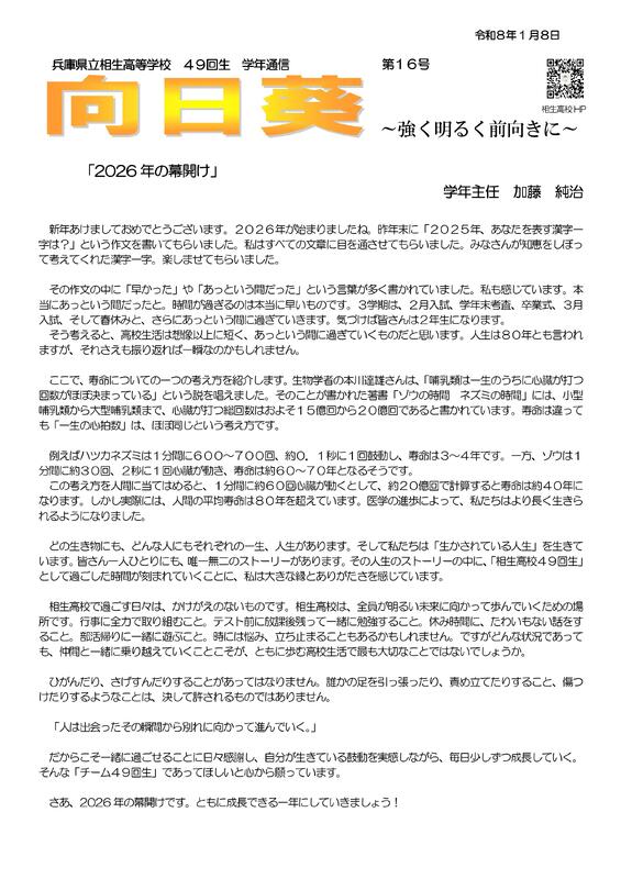 49回生 学年通信 第16号を発行しました。新年幕開け号です。学年主任のメッセージを掲載しています。
