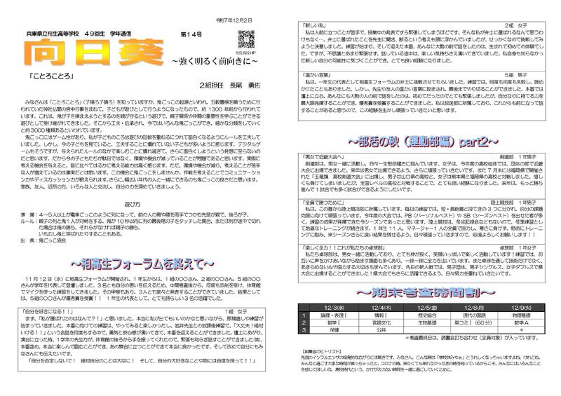 【49回生 学年通信】第14号を発行しました 投稿日時 : 12/02 49回生 49回生 学年通信 第14号を発行しました。2組担任のメッセージ、相高生フォーラムの感想、部活の秋(運動部 後編)等を掲載しています。