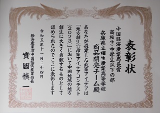 これは、内閣府及び経済産業省が、地域経済分析システム(RESAS)等による分析を踏まえた政策アイデアを募集する「地方創生☆政策アイデアコンテスト2023」において、中国地域を分析の対象とした応募者の中から最終審査会のファイナリストに選出されたため表彰状を授与していただきました。12月に東京で実施される最終審査会では中国地方代表として頑張ってきたいと思います。