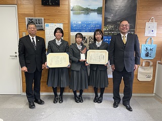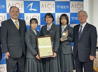 本日、相生市長様を表敬訪問させていただき、地方創生★政策アイデア コンテスト2023の優秀賞受賞のご報告をさせていただきました。また、この結果に対して、相生市文化芸術顕彰金賞を授与していただきました。生徒たちは、自分たちの取り組みを評価していただいて喜んでいました。