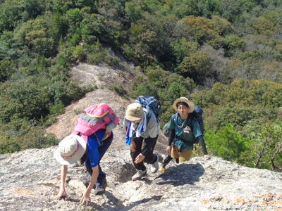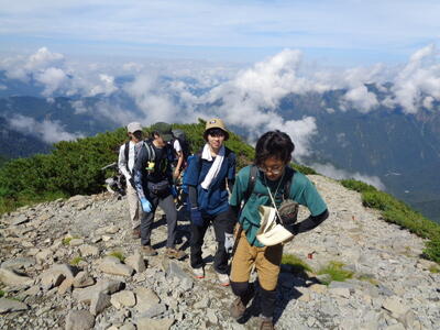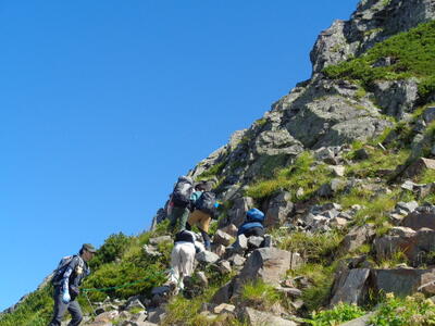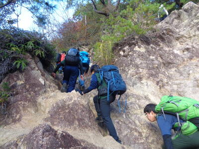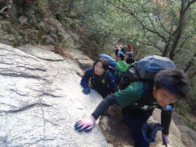 男子は大会仕様の15キロの重さのザックを背負っていますが途中でへこたれることもなく、岩場もへっちゃらですたすたと登っていきます。女子も余裕でついていきます。なかなかやるな。成長したな。でも、ちょっと待ってくれ~。こちらは青息吐息・・・。