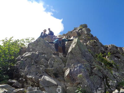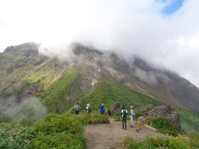山頂はガスが出て真っ白。ちょっと残念。昨日の雨で岩場は滑りやすく苦労しましたね。私も足を取られ何度か盛大にこけました。
