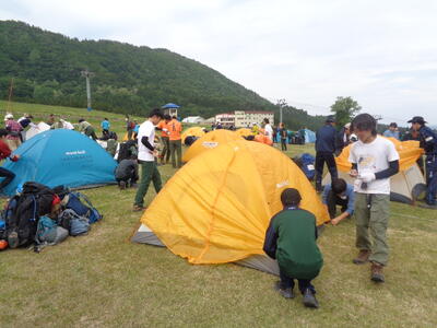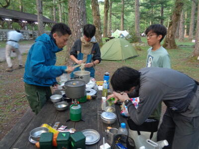 各団体無事下山してからは、またテントを張り今度は炊事審査です。各校とも工夫を凝らしたメニューを披露。競技中ではありますが何だか楽しそうです。その後は監督・リーダー会で終了。就寝時刻は午後9時です。お疲れさまでした。