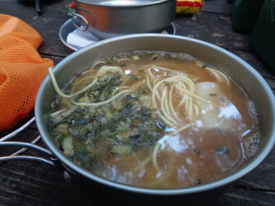 テント設営が終わると皆さん川遊びへ。ここは修験者が修行の途中で立ち寄ったことが起源の温泉街としても有名で、また川遊びも盛んなところ。私もキャンプ地の小川に足を浸してみましたが冷たいのなんの。夜は炊事棟で夕食の調理。焼きそばをおかずに白ご飯!みんなしっかり食べる。う~ん、若者やな・・・。明日はいよいよ登山だ。