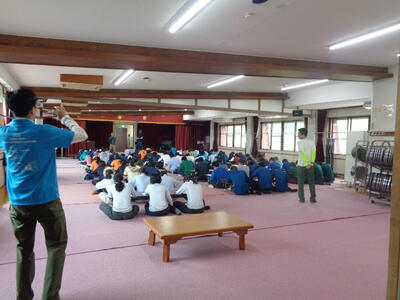全員体育館に全員集合して、登山の中止を告げ、代わりに急遽ミニ天気図講座や、交流会が行われました。いくつかの学校ごとに輪になって自己紹介からいろいろな話し合い。一発芸大会になったり輪になってバレーボール大会になったり、恋バナで盛り上がる女子会も。その後は結果発表と表彰式。前日の審査結果の集計だけで順位がつけられました。