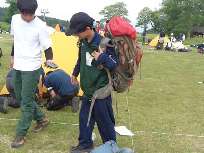 好天に恵まれた一日目は、まず最初にテントを張る位置を決める区画割をみんなで手伝います。それからいよいよ審査開始。まずはテントの張り方を審査する幕営審査。その後、知識審査と天気図審査が行われます。知識審査は登山に関する知識をテスト形式で審査します。また天気図審査は実際に気象通報を聞き天気図を書きます。その後は装備審査。持ち物が揃っているか、適切に保管されているか(防水など)審査します。