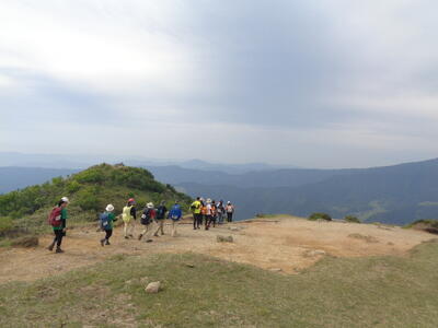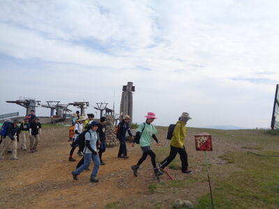 最終日は装備審査の3回目が行われましたが、あとは全校生、全職員でパーティ登山。鉢伏山頂を通過しながらぐるっと鉢伏高原を一周します。もう審査も行われません。各校とも和気あいあいと交流を深めながらの登山行動です。私も最後尾から参加しました。やはり山は楽しい!