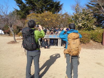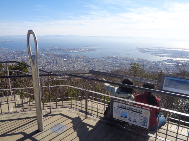 黒岩尾根はマイナールートのようで、すれ違うハイカーもほとんど居なかったのですが、摩耶山山頂に着くと、多くのハイカーや観光客でびっくり。やはり人気スポットですな。いつもはパスしてしまう三角点(本当の頂上)も通過。ついでに皆で記念撮影も。あとは掬星台(山上広場)でのんびり昼食タイム。風もなく暖かくて最高のビュースポットでした。
