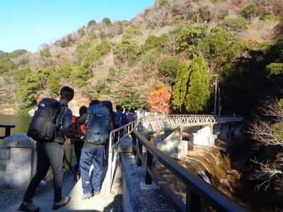 JR生瀬駅からスタート。武田尾駅までいくつかのトンネルを通って廃線跡を歩きます。気温も少し穏やかになり武庫川の水音も清々しい。真っ暗なトンネルの中はひんやりしてなんとも気持ちがよい。なかなか素敵なハイキングコース。ですが、実は男子部員は15キロ、女子部員は8キロの重りを背負ってのトレーニング。そして本番はまだまだこの先だ。