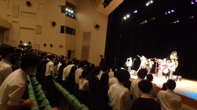 ところで、空気の振動である音は、音ただそれだけの存在ではありません。情報を伝えるメディアであったり、文化の担い手であったり、あるいは心を癒やしてくれたり、勇気や希望を与えてくれたりします。金管楽器と打楽器による迫力ある演奏でしたが、生徒達はそれぞれにその音から何かを感じ取ってくれたことと思います。