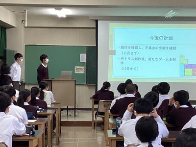 理数探究類型の2年生が、4月から取り組んでいる課題研究の中間発表会として化学、生物、物理、情報・数学の分野で11班に分かれて進めてきた研究の進捗状況を発表しました。前日遅くまで残って練習してきた成果が発揮され、どの班も聞き応えのある発表で、先生方だけでなく1年生の生徒からも次々と質問が出ました。予想外の質問に慌てる場面もありましたが、研究内容をレベルアップさせるための今後の糧としてほしいと思います。また、専門的な見地から指導助言をいただいた皆様に心よりお礼申し上げます。