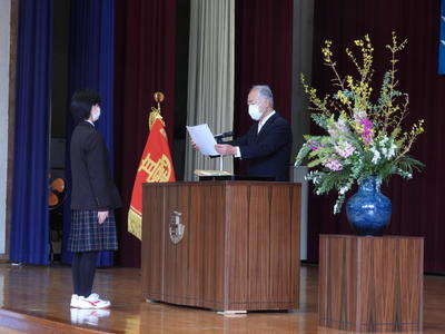 講堂で行った「学校説明」では、生徒会、演劇部が作成した学校紹介動画をそれぞれ披露し、明石高校の魅力を発信しました。また、夏季休業中にオーストラリアにある姉妹校モーリー高校への短期留学に参加した生徒が、体験内容を日本語と英語で報告しました。その後、明石高校の進路指導・学習指導について、北中校長先生が熱く語りました。