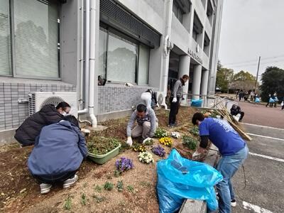 正面玄関横の花壇と明高ガーデンの草刈りを行いました。
