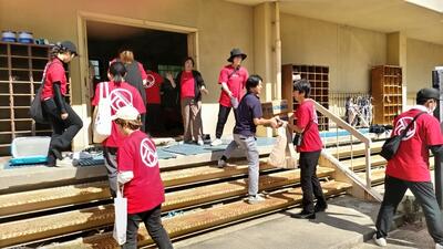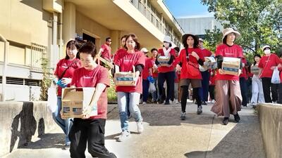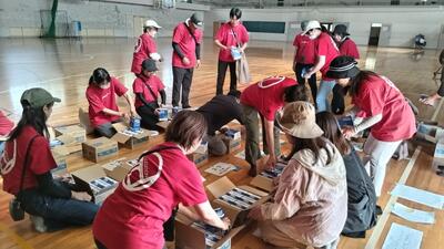 PTA役員・協力員で仕分けし、生徒テントで手渡ししました。