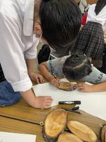 その後、5班に分かれて、各班10枚の銘板に樹木の名前を書き込みました。小学生は、大胆なタッチで、かわいい銘板に仕上げていました。
