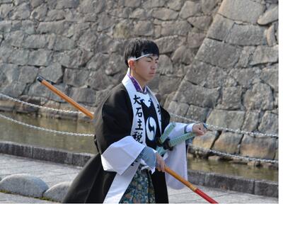 祭りを盛り上げる「忠臣蔵パレード」では、地域の方々と一緒に、本校の生徒会長が大石主税役をする