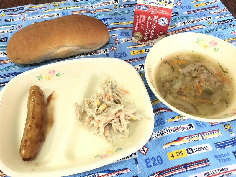 本日の給食は、パンと牛乳に加え、チキンウインナーやベーコン入りのコンソメスープ、ごぼうサラダと栄養バランスの取れた献立でした。スープは玉ねぎやキャベツ、セロリなど野菜の旨味がしっかり感じられ、ベーコンの風味がアクセントになっていました。ごぼうサラダは食感がよく、ノンエッグマヨネーズでさっぱりと仕上がっており、アレルギー対応にも配慮されています。全体的に彩りもよく、野菜が豊富で食べやすい内容でした。校長先生は、ホットドックを作ってみましたよ。みんなはどんな食べ方をするかな。楽しみです。