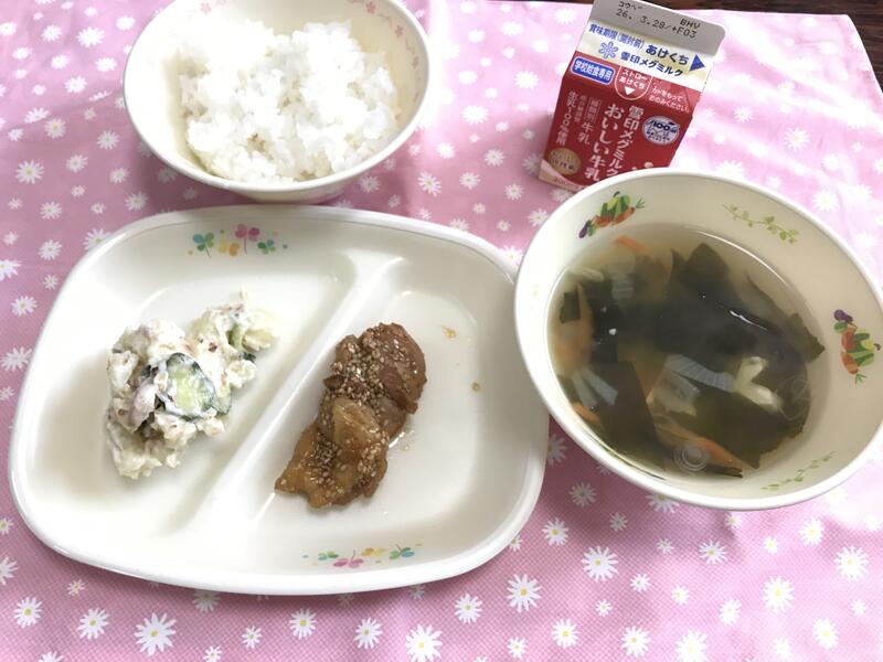 ごはん ぎゅうにゅう とりにくのごまずがけ わふうポテトサラダ わかめスープ