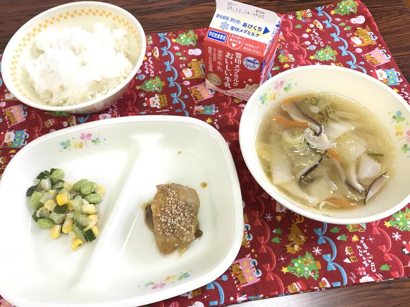 今日の献立は、ごはんと牛乳に加え、鶏肉のごま掛け、コロコロサラダ、ワンタンスープと、栄養バランスに優れた内容でした。鶏肉はやわらかく、ごまの風味が食欲をそそりました。ノンエッグのごまドレッシングを使ったサラダは、コーンや枝豆の彩りがよく、食感も楽しめました。ワンタンスープは白菜やもやし、人参が入り、野菜の甘みと豚肉の旨味が調和していました。ワンタンがご飯のおかずにピッタリでした。美味しかったです。