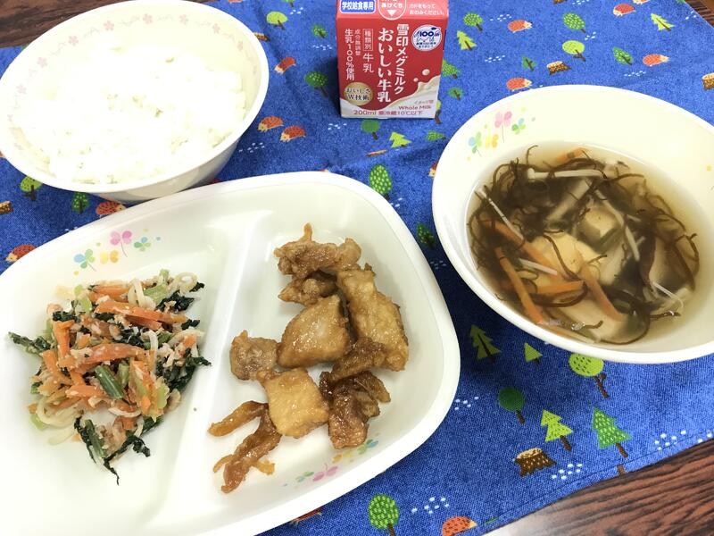ごはん 牛乳 もずくスープ とりにくのレモンづけ こまツナあえ