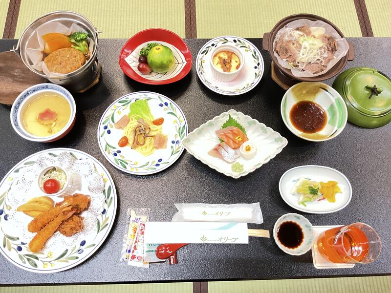 ホテルオリーブに戻ってきました。すこしつかれ気味でしたが、きれいなホテルの部屋にはいると再び笑顔が満開になりました。「祥風」しょうふうという舞台付きの宴会場で豪華な夕食をとりました。