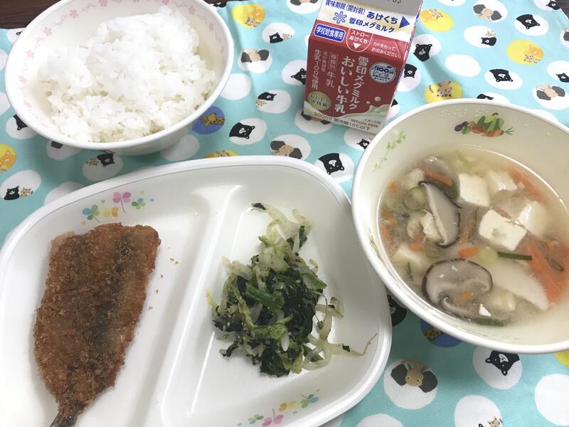ごはん ぎゅうにゅう いわしフライ おひたし みぞれじる