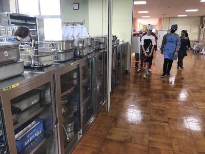 新しくなった配膳室に中学部生徒が給食をもらいにやってきました。それぞれの役割が決められています。